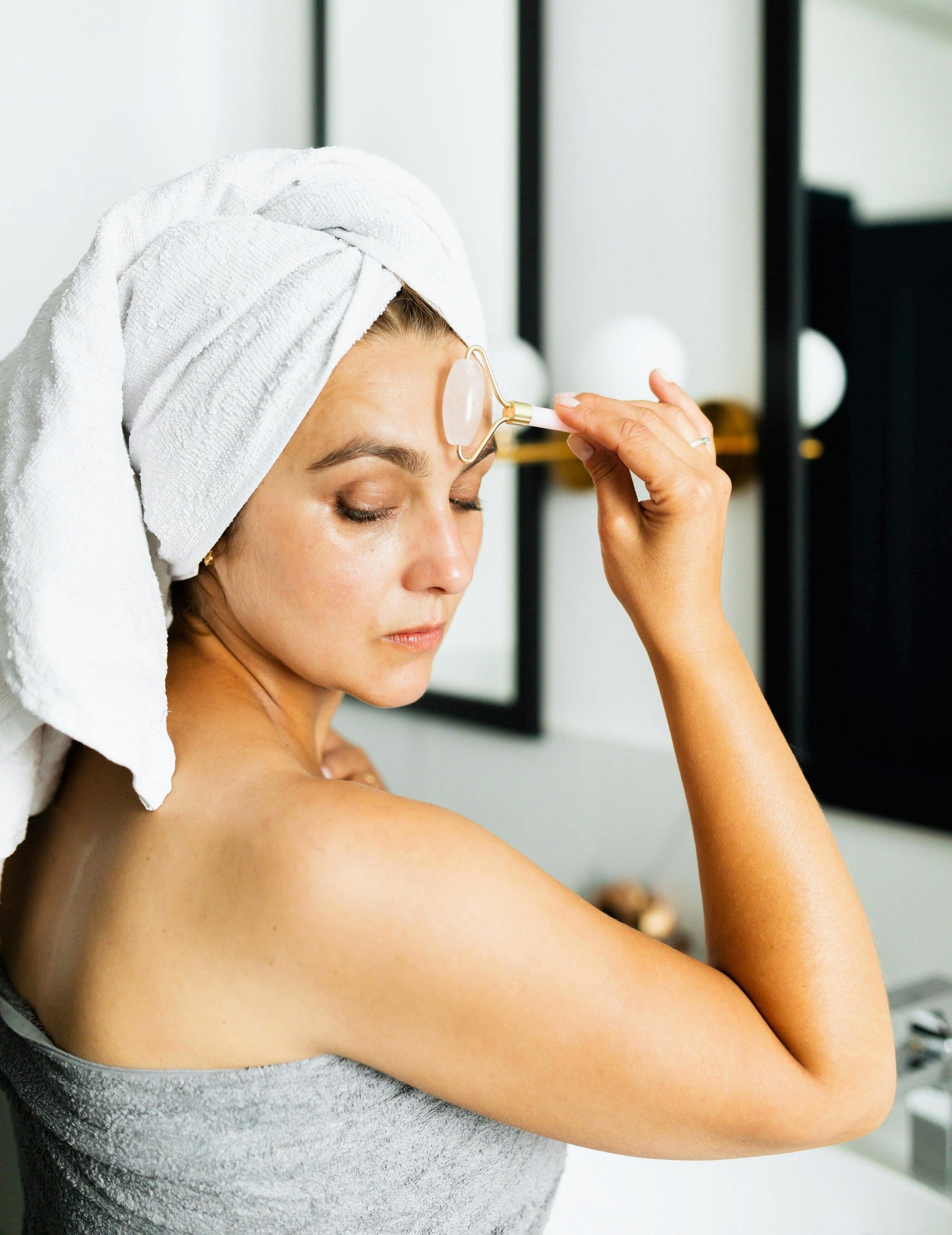 - Forehead: Begin in the middle of the forehead and roll outwards towards the temples. Use the larger end of the roller for this.